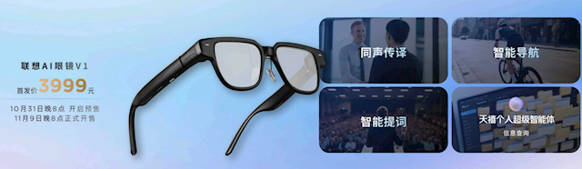 快科技10月31日消息,联想AI眼镜V1今晚正式发布,定价3999元,将于11月9日正式开售。